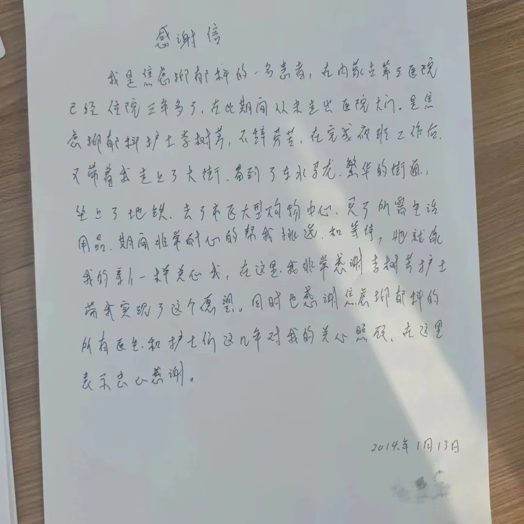 在李树芳护士的陪同下,张大哥第一次坐上了呼和浩特市的地铁,来到超市,购买生活用品。还去了饭店,打包了几个喜欢吃的菜。中午时,李护士把张大哥安全地送回了病房,张大哥非常高兴,写下了一封情真意切的感谢信,表达对医护人员的感激。