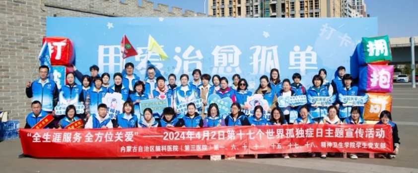 今年的4月2日是第十七个世界孤独症日,宣传主题口号是“全生涯服务,全方位关爱”。为提高公众对孤独症的认知,促进孤独症的社会融合,营造尊重、包容、理解、关心、关爱的社会氛围,内蒙古自治区脑科医院联合自治区残疾人联合会、自治区精神残疾人及亲友协会举办了主题为“感党恩、听党话、跟党走”——世界孤独症日主题宣传活动。自治区残疾人联合会组联部一级调研员赵桂云,自治区脑科医院党委副书记、院长、自治区精神残疾人及亲友协主席于东升,自治区脑科医院副院长王文忠,呼和浩特市残疾人联合会党组成员、副理事长徐帆,呼和浩特市卫生健康委员会四级调研员吴东东,呼和浩特市精神卫生项目办主任李春峰,呼和浩特市新城区残疾人联合会副理事长张俊峰,自治区精神残疾人及亲友协会副主席张婷婷,社会爱心人士及志愿者代表参加本次活动。