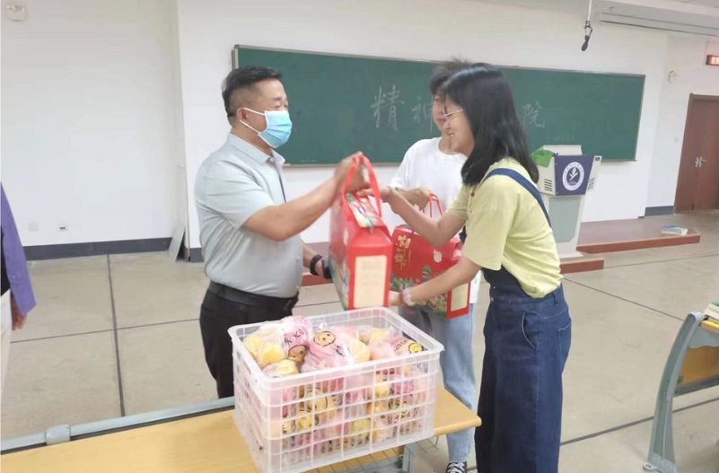 9月9日下午,郑兰兵副院长来到了内蒙古医科大学新华校区,看望了在这里学习生活的40名2019级本科生。郑院长将中秋节的关环送达至每位同学,同时也深入了解同学们生活和学习中存在的不便和困难,并予以积极解决。详细解答了同学们关于就业择业及未来职业发展方面的困惑,给予意见。希望同学们珍惜宝贵时间,努力学习,为成为一名优秀的精神科医师打好坚实的基础。