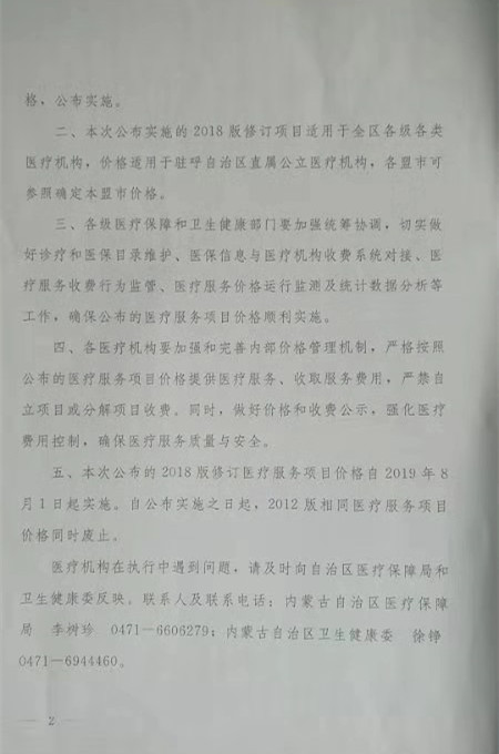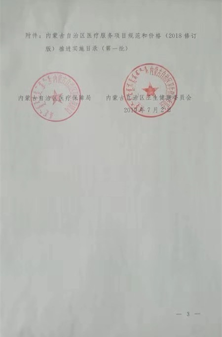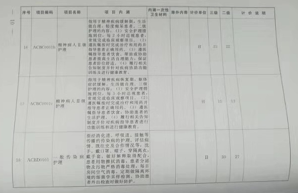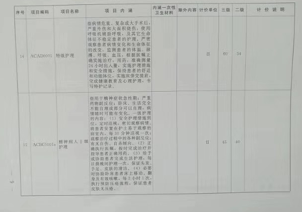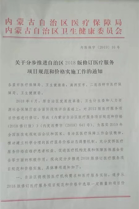 根据内蒙古自治区医疗保障局和卫生健康委员会《关于分步推进自治区2018版修订医疗服务项目规范和价格实施工作的通知》(内医保字〔2019〕16号)精神,澳门金沙参照执行2018版第一批修订项目和价格有三项新增项目:精神病人护理Ⅰ、Ⅱ、Ⅲ级(分别为45元/日、25元/日、15元/日),替换原来的精神病人护理15元/日,执行时间为2019年8月1日零点,新项目启用,旧项目停用。