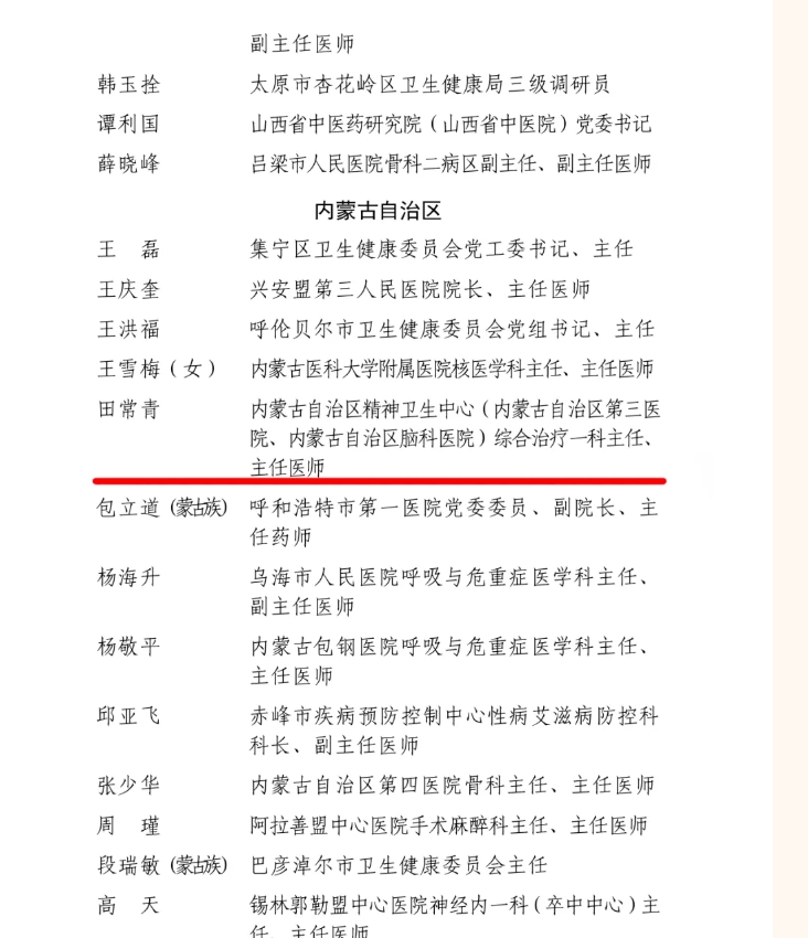 自治区精神卫生学科专家田常青主任深耕精神科医教研工作27年,在学科建设与临床实践领域取得突出成就。作为学科带头人,他主持制定《内蒙古自治区精神康复重点学科评审标准》,填补国内相关领域空白;带领团队获评“全国精神康复示范基地”,并荣获“精神分裂症回归社会特殊贡献奖”。完成三十余篇高质量论文,主编专业书籍在行业内具有重要的指导价值。