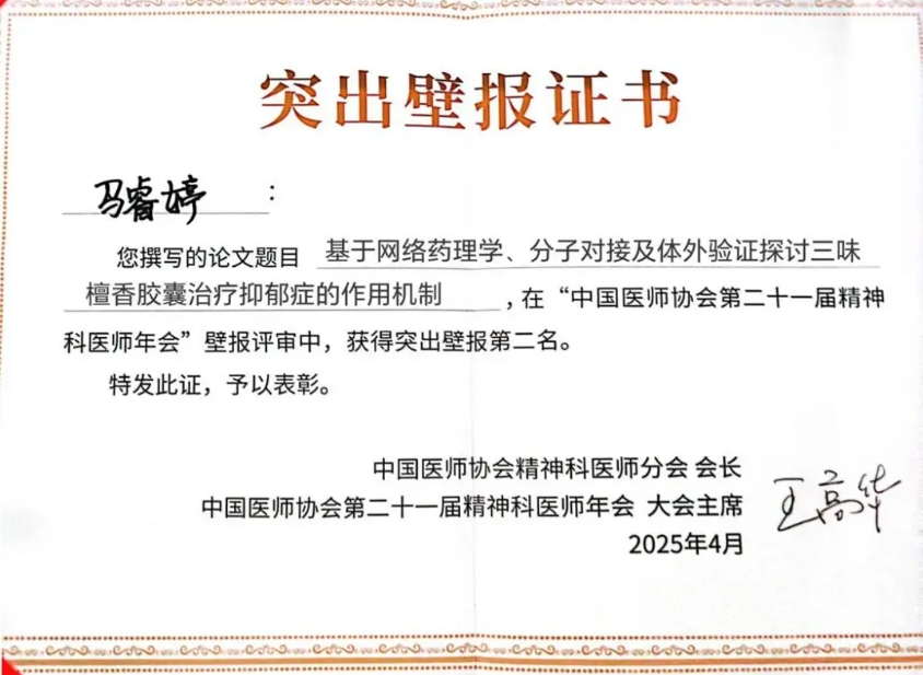 2025年4月8日至12日,由中国医师协会、中国医师协会精神科医师分会主办,浙江大学医学院附属第一医院、浙江大学脑医学与脑科学学院承办,浙江省医师协会协办的“中国医师协会精神科医师分会第二十一届年会(CPA2025)”在浙江省杭州市隆重召开。澳门金沙医学检验科主管药师马睿婷撰写的论文《基于网络药理学、分子对接及体外验证探讨三味檀香胶囊治疗抑郁症的作用机制》荣获大会论文评审第二名、壁报评审第二名。