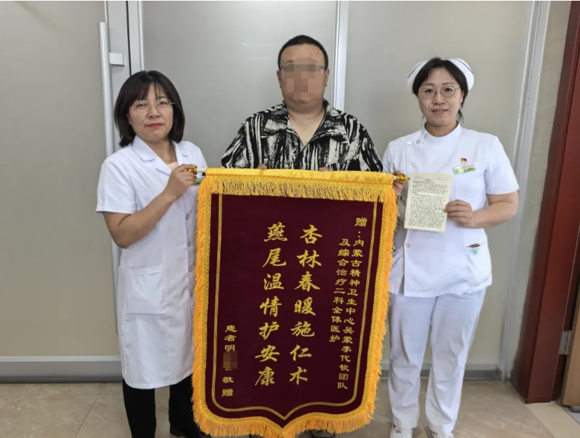 5月26日,内蒙古自治区脑科医院综合治疗二科的医护人员收获了一份特别的礼物——患者的家属将一面绣有“杏林春暖施仁术,燕尾温情护安康”的锦旗和一封情真意切的感谢信及用心制作印有“敬赠内蒙古自治区脑科医院吴蒙、李代钦团队,医德双馨”的中性笔送到了综合治疗二科科主任、护士长手中,以此表达对全体医护人员精湛医术和贴心服务的由衷感激与高度赞誉。