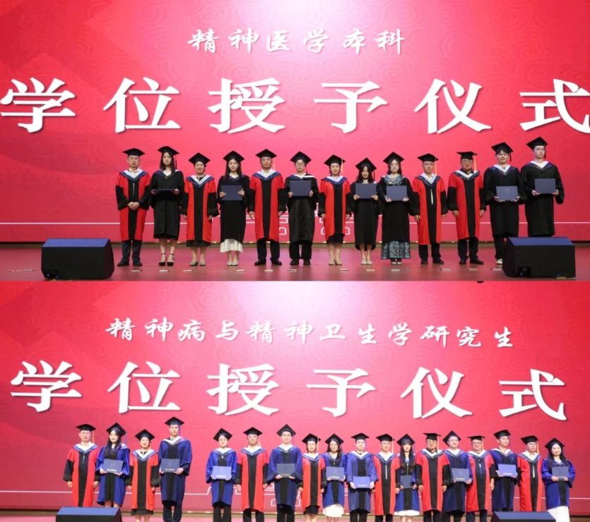 现场举行精神医学本科、精神病与精神卫生学研究生学位授予仪式及住院医师结业证明授予仪式,毕业生代表张宇萌、杨铭谦、巩宇娜发表毕业感言。