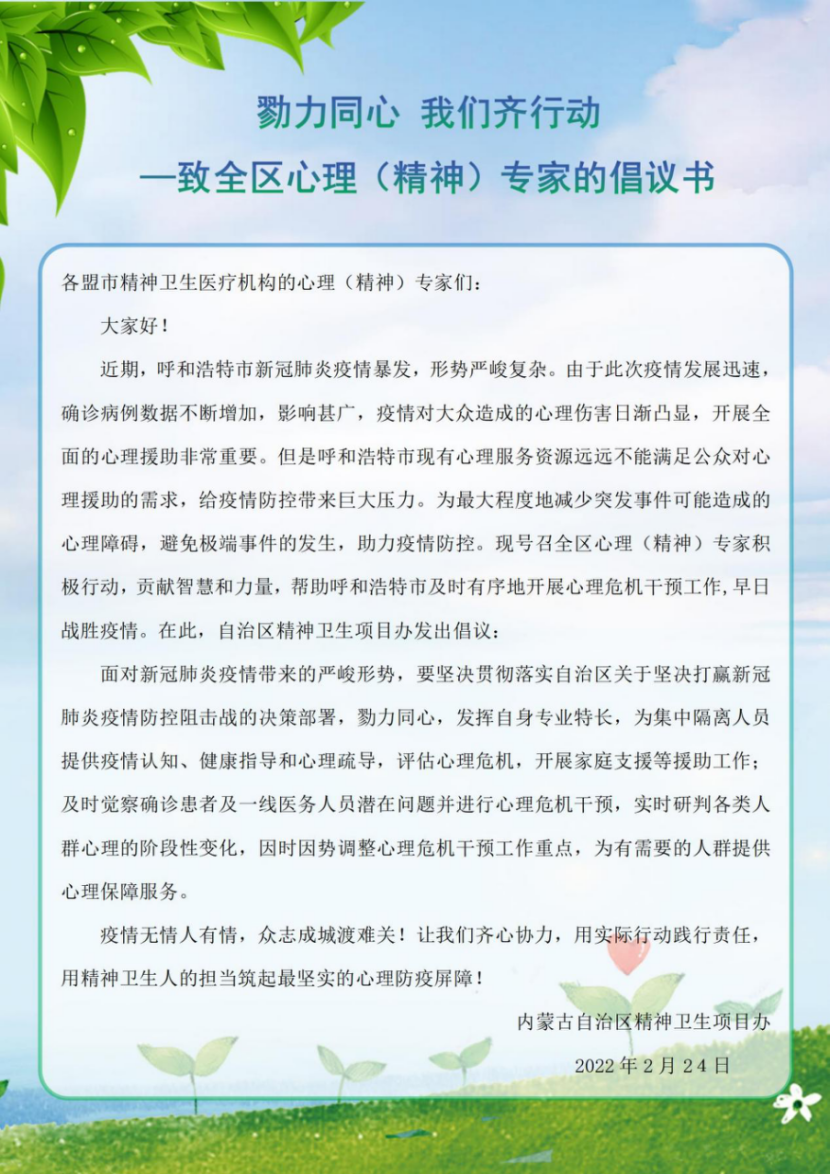 、自治区精神卫生项目办勇挑重担,积极响应,主动作为,隋晓杰院长(项目办主任)亲自挂帅,靠前指挥,统筹协调安排医院疫情防控工作和公共卫生工作。第一时间作出指示,要认真落实自治区疫情防控指挥部医疗防控组下发的“关于进一步加强新冠肺炎疫情期间心理干预和严重精神障碍患者管理的通知”,按照《内蒙古自治区针对呼和浩特市新冠肺炎疫情期间心理危机干预工作方案》要求,由自治区精神卫生项目办牵头,携手澳门金沙十二个医疗中心和十二个盟市,充分发挥专业优势,科学、规范地开展疫情期间呼市定点医院、隔离酒店、管控小区、封控小区(村)的心理危机干预工作。